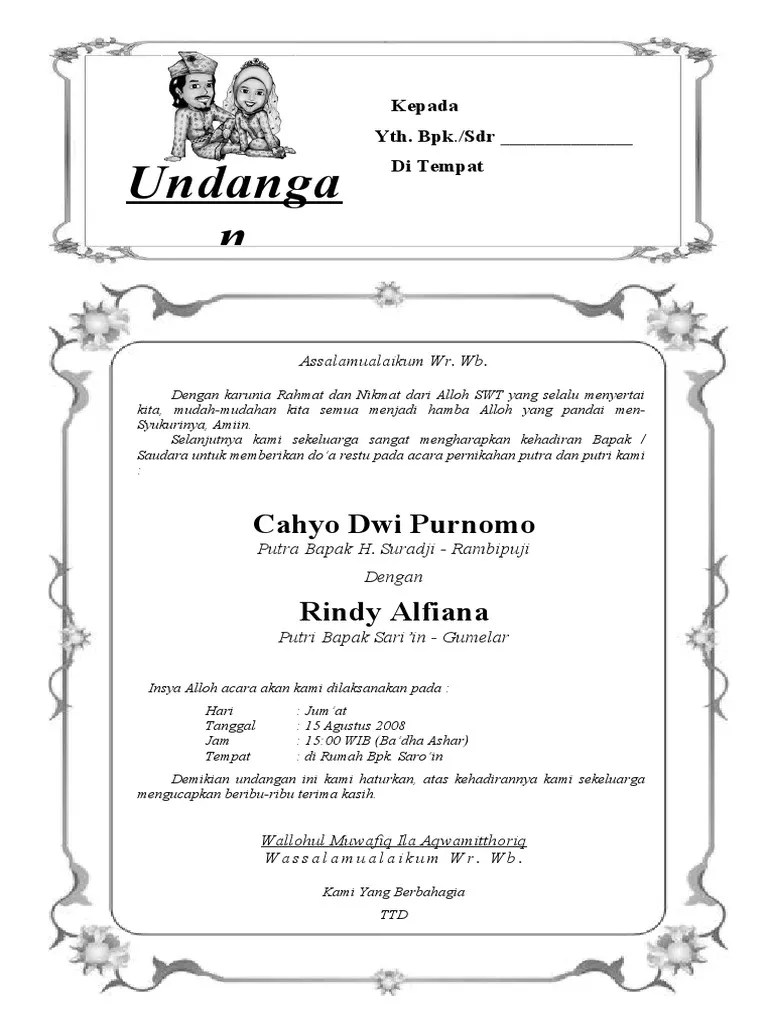 Download undangan walimatul ursy format doc koleksi undangan, desain undangan contoh, undangan, unik. Download undangan walimatul ursy (.doc); Walimatul ursy atau walimatun nikah merupakan acara syukuran atas. Upload file contoh undangan pernikahan walimatul ursy dengan format microsoft word.doc. 7/22/2019 contoh undangan walimatul ursy.doc. Donwload undangan format doc word, macam bentuk seperti walimatul ursy, bisa di edit sesuai nama dan alamat yang dibutuhkan. Wahono / ibu widji (alm). Download undangan microsoft word berikut share contoh format file undangan berbagai macam acara walimatul ursy walimatul khitan selapanan tahlil 40 hari 100 . (pernikahan) unik siap edit format word warna (doc a4) akan kami bagikan . Namun, corak batik di bagian sudut atas maupun bawahnya membuat kartu invitasi ini tampak lebih mewah. 30 contoh undangan walimatul ursy download doc bisa download undangan walimatul ursy bila membutuhkan template undangan pernikahan anda bisa .